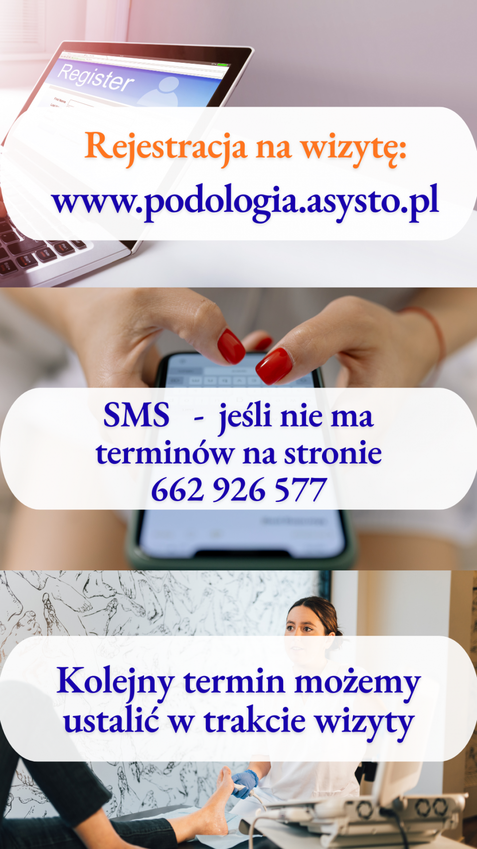 Pytania dotyczące wizyt proszę kierować na adres: gabinet@podo.int.pl bądź numer telefonu 662 926 577 pisząc wiadomość SMS.